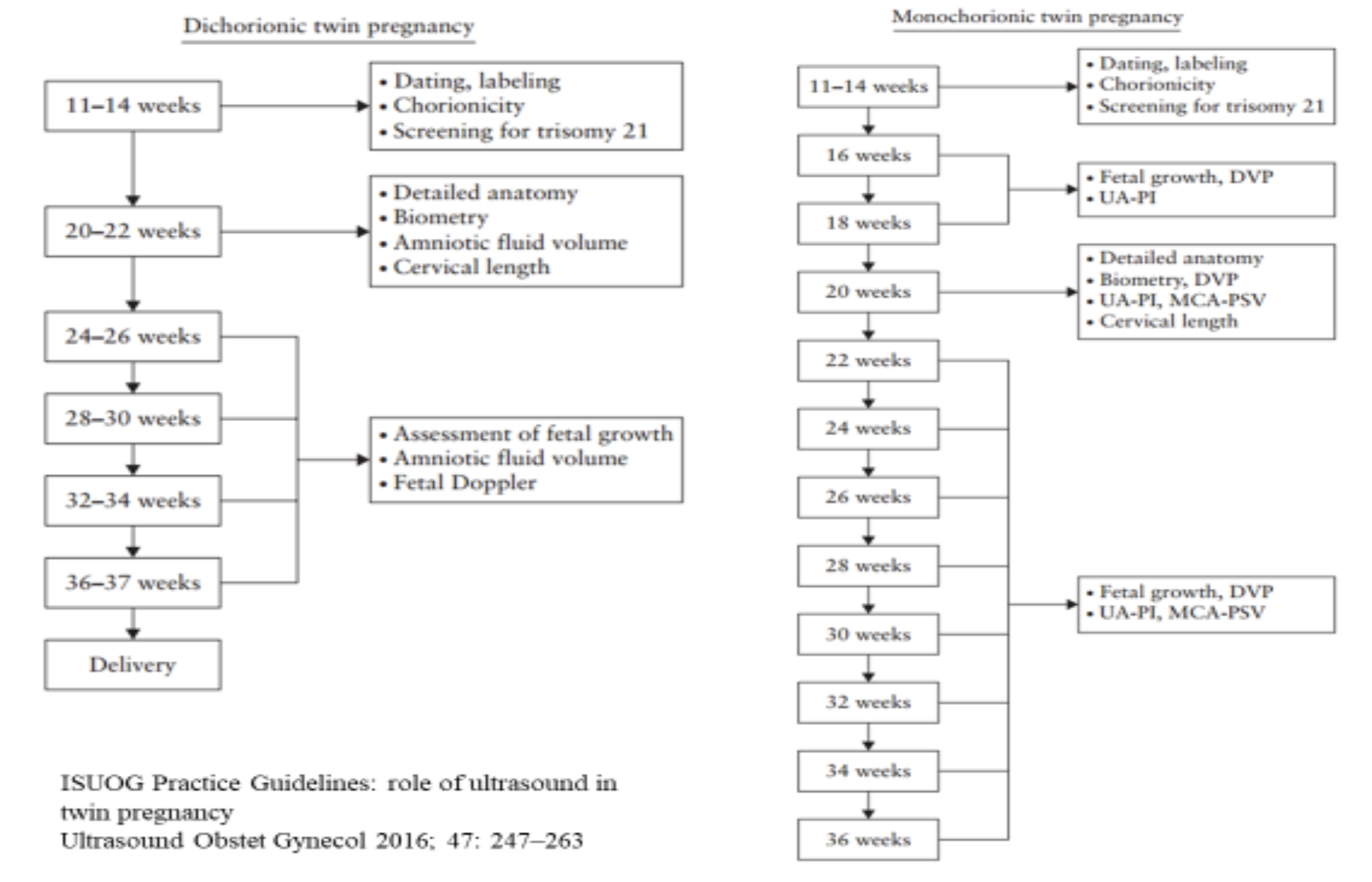 A prenatális ultrahang monitorozása a dichoriális és a monochoriális terhességek esetében különbözik az alábbi ábrán látható módon: