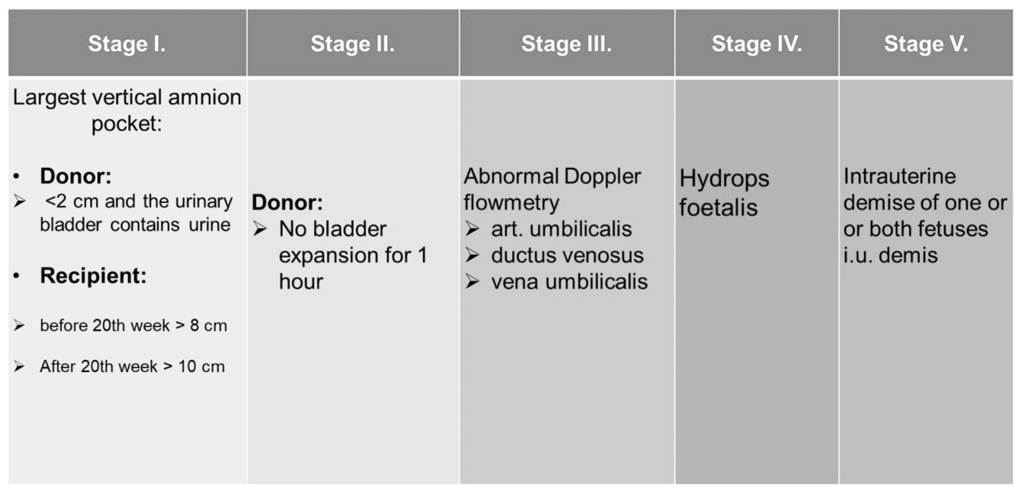 - Iker-iker transzfúziós szindrómában (TTTS), amelyet polihidramnion-oligohydramnion szekvenciának is neveznek, ahol a vérátömlesztés a donor ikertestvértől történik, aki vérszegény, növekedésben korlátozott, sápadt lesz, és oliguriát és oligohydramniont alakít ki, a recipiens testvéréhez, aki policytém, a keringése túlterhelt, polyuriás, polyhydramnion és pangásos szívelégtelenség alakul ki, majd hydrops foetalis. A TTTS-es monochorialis terhességben az AV-anasztomózisokban egyirányú áramlása alakul ki. A chorionboholyban az oxigenizáció befejezése után a vér a recipiens placenta vénáján keresztül elhagyja a közös részt. Ez a kiegyensúlyozatlan áramlás végül a donor iker esetében a vér térfogatának kimerülését, a recipiens ikereknél pedig térfogati túlterhelést eredményez. A TTTS az MCDA ikrek 10-15%-ában fordul elő, ha nem kezelik, a perinatális mortalitás 80-100%. TTTS manifeszt a 15-26 gestatios hét között. Ezt az állapotot ultrahangvizsgálattal diagnosztizálják, és az állapot súlyossága a Quintero stádiumrendszer segítségével értékelhető, az alábbi táblázat szerint: