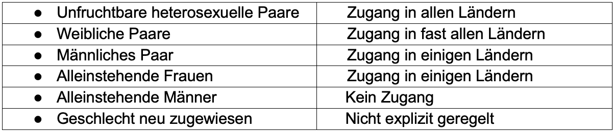 - Unfruchtbare heterosexuelle Paare: Zugang in allen Ländern