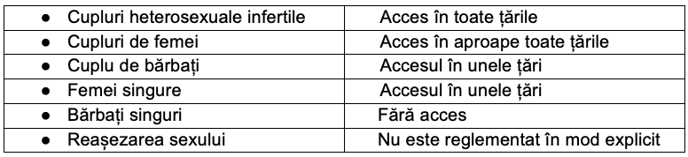 În 11 țări - Albania, Bosnia și Herțegovina, Republica Cehă, Franța, Italia, Republica Cehă - accesul este restricționat prin lege pentru cuplurile heterosexuale. Lituania, Polonia, Slovacia, Slovenia, Elveția și Turcia. În cinci din aceste unsprezece țări, tehnicile de terapie antiretrovirală și de fertilizare cu injecție intrauterină sunt permise și pentru femeile singure și cuplurile de același sex. Majoritatea țărilor se situează undeva între aceste două extreme, cu un total de 30 de țări în care tratamentele sunt disponibile pentru femeile singure și 18 țări în care tratamentele sunt disponibile și pentru cuplurile de femei.