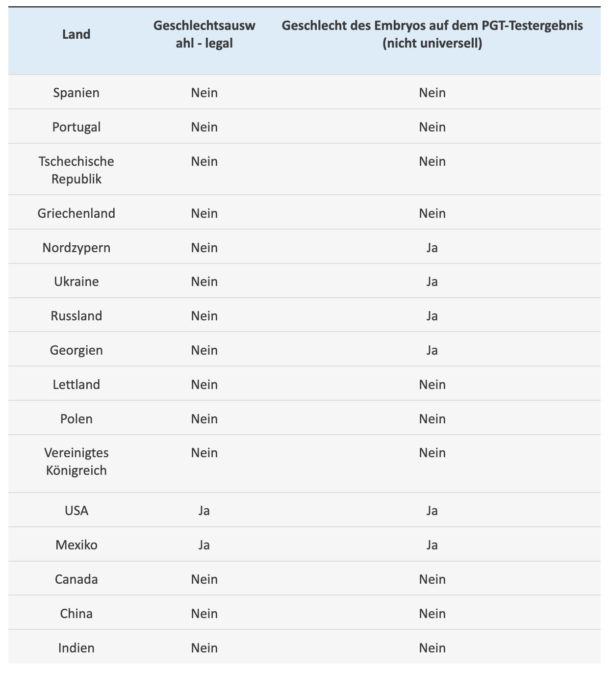 Die Geschlechtsauswahl von Embryonen (außer für PGT-M bei geschlechtsgebundenen Erkrankungen) ist in keinem der 43 Länder erlaubt.