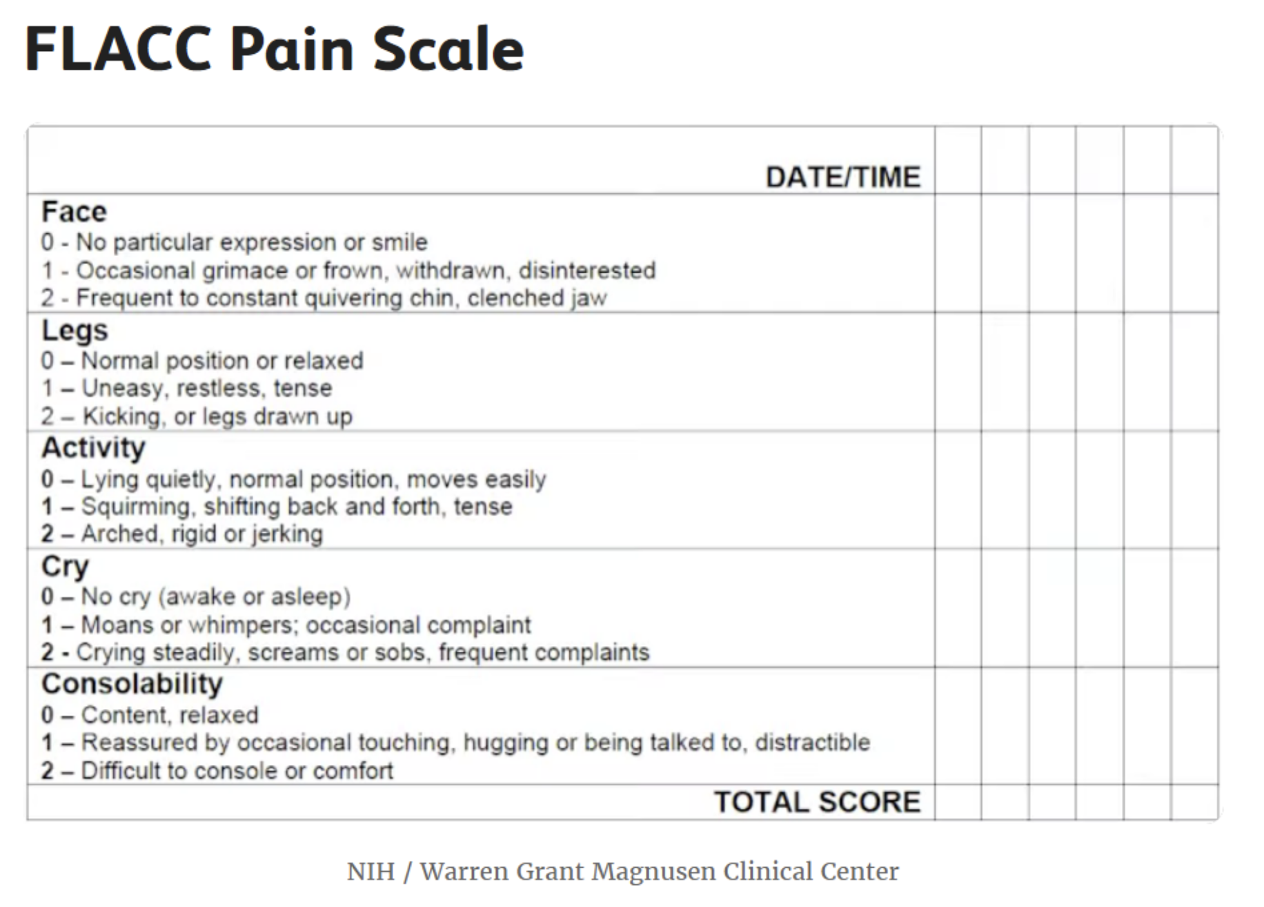 A FLACC fájdalomskála az egészségügyi szolgáltató által végzett megfigyeléseken alapul. Eredetileg kisgyermekek értékelésére készült, de bárki számára használható, aki nem tud kommunikálni.3